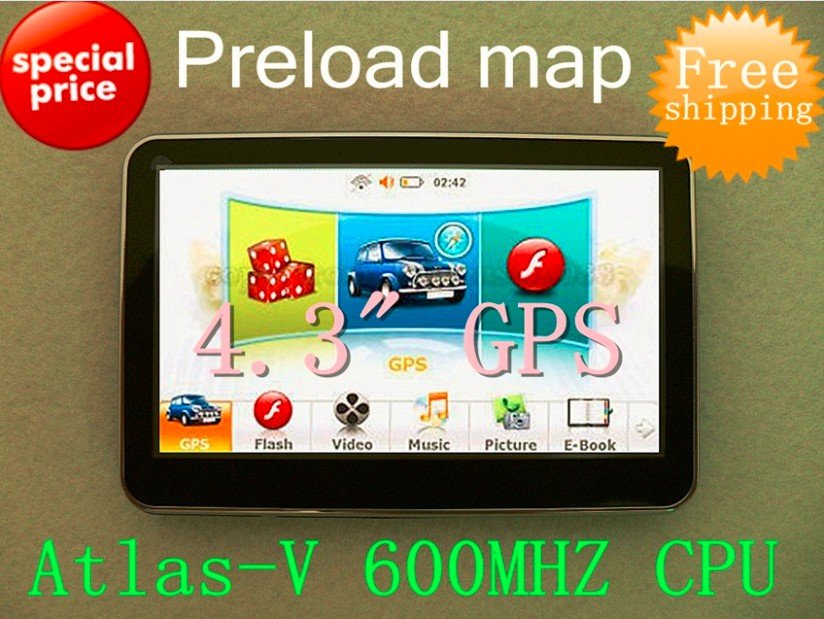 4.3 Inch GPS Navigation System, Sirf Atlas-V Dual Core 600MHZ,128RAM,Built-in 4GB, Preload Map |
