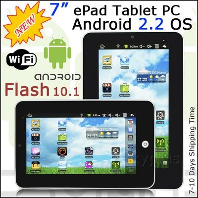 Place of Origin: Guangdong China (Mainland) Screen Size: 7.2" Products Status: Stock Processor Brand: VIA Type: Netbook,Tablet PC,UMPC,Not... Processor Main Frequency: ARM926 533MHz Memory Capacity: 256MB Weight: 680k Model Number: M001B Processor Type: VIA VT8650 Hard Drive Capacity: 2GB Operating System: Google Android 2.2 Display: 800 * 480PX Resolution Net connect: WIFI & USB 3G Android Market: YES Camera: 1.3M pixtel G-sensor: 3 sides G-sensor Colour: Silver