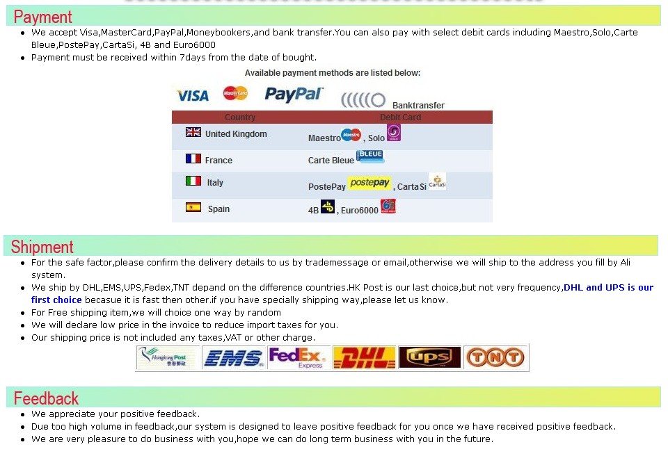 Delivery time:1 days for 1-10 pcs by DHL/EMS/TNT/UPS express with free shipping